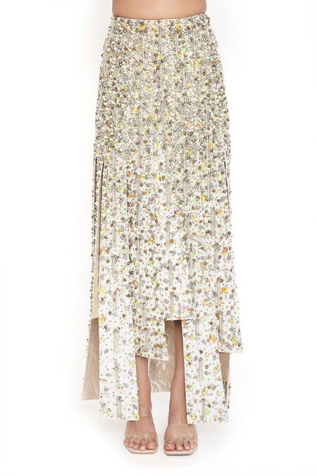 Off white blouse featuring bead, sequin, stone embroidery with tassel detailing on the shoulder. Paired with an embroidered asymmetric skirt with a front slit.