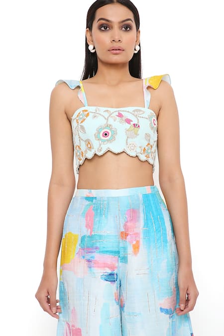 Aqua bustier featuring embroidered floral motifs, scallop trim hem, and ruffle sleeves. Paired with painterly print palazzo with a semi-elasticated waistband.