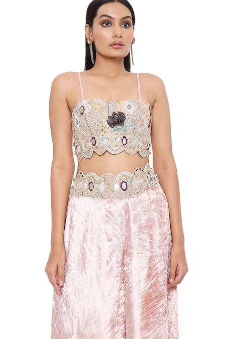 Rose pink jacket with sequin, geometric embroidery. Paired with bustier & palazzo.