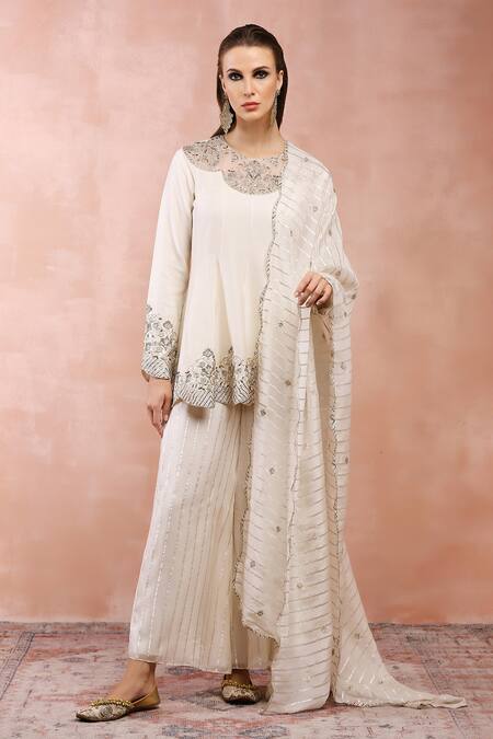 Off white peplum kurta featuring organza cut work yoke and gold floral pattern zari. Paired with a palazzo featuring woven gold stripe pattern and an embroidered dupatta.