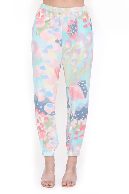 Multi Color Crepe Printed Floral Euphoria Embroidered Kaftan And Jogger Set