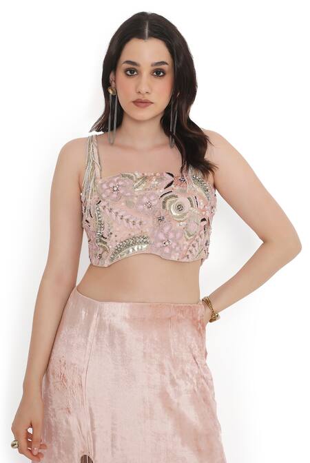 Blush pink sleeveless blouse featuring all over fleur bloom garden embroidery with dangling bead tassels on the sleeves hem. Paired with a velvet skirt that has a slit detail and an attached inner lining.