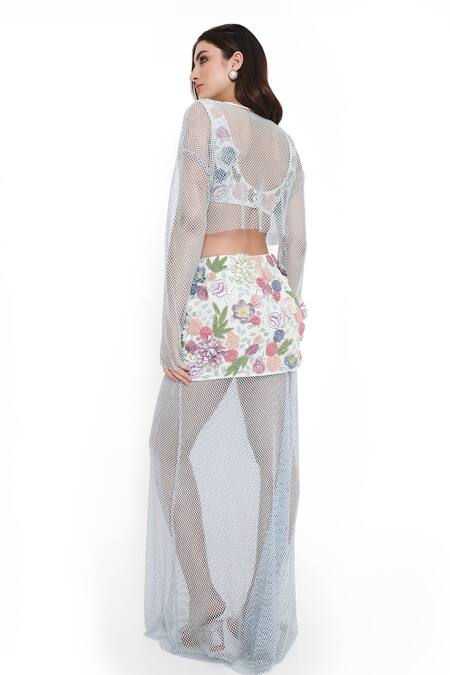 Blue mesh skirt set featuring a floral applique embroidered top with bead and thread work. Includes a short skirt and a long mesh skirt with attached lining.