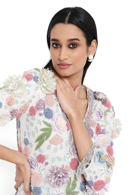 Off white kurta featuring floral applique work with a V neck and three-quarter sleeves. Paired with embroidered pants showcasing similar floral design and slits.