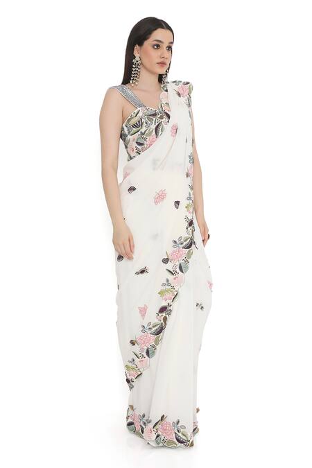 Ivory georgette saree featuring floral thread embroidered cutwork border. Paired with a floral embroidered blouse with attached lining.