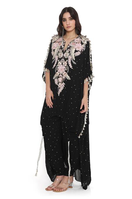 Black kaftan featuring floral thread embroidery, kimono sleeves, and a drawstring hem. Paired with matching jogger pants for a relaxed fit.