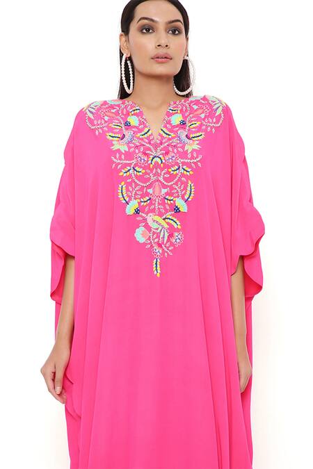 Pink kaftan featuring multicolor floral embroidery on the yoke and scallop trim on the border