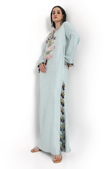 Blue kaftan crafted in dola silk featuring floral thread embroidery and tassel highlights along the slits and sleeves
