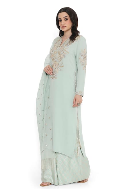 Blue kurta featuring floral embroidery on the yoke and sleeves. Paired with a matching palazzo and dupatta with mukaish work.