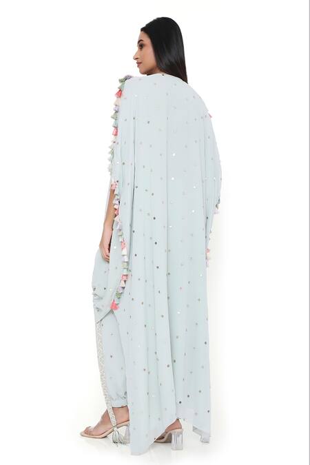 Blue Georgette Embroidered Mukaish V Neck Floral Tasseled Kaftan And Jogger Set
