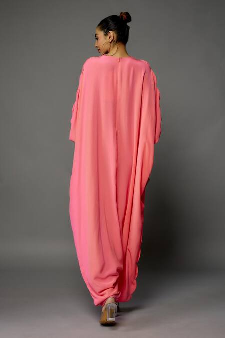 Coral jumpsuit featuring a notched neckline and batwing sleeves with floral embroidery on the yoke