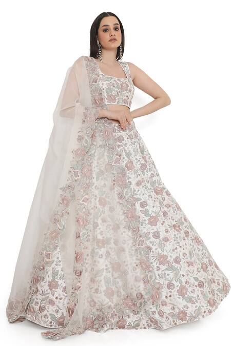 Ivory Dupion Silk Embroidered Floral Square Thread Lehenga Set