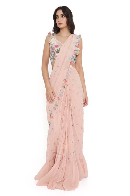 Pink pre-draped saree featuring a frilled hem and mukaish work. Paired with a floral embroidered blouse with a leaf neckline and sleeveless design.