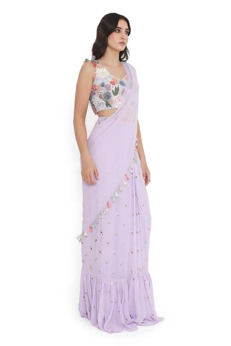 Lilac pre-draped saree featuring a frilled hem and mukaish work. Paired with a floral embroidered blouse adorned with tassels.