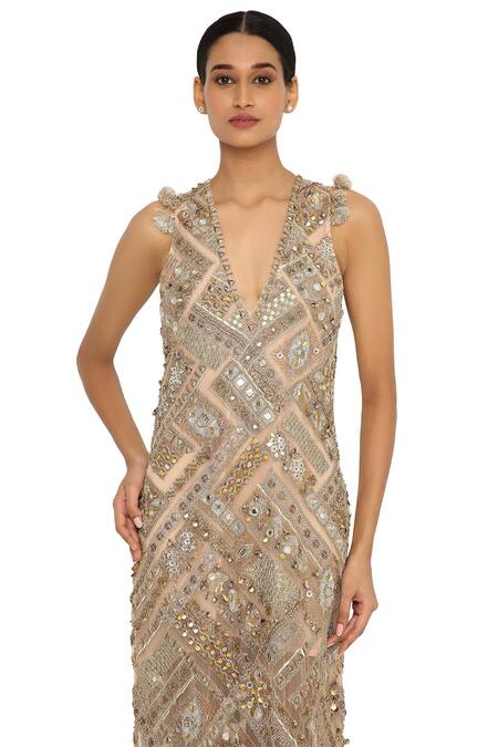 Beige Net Embroidered Geometric V Neck Hamsa Gown