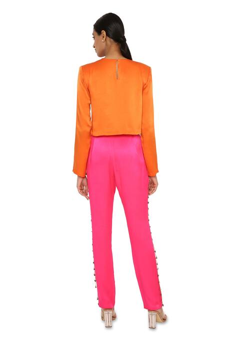 Orange satin crop top with hamsa embroidery. Paired with hot pink satin pant.