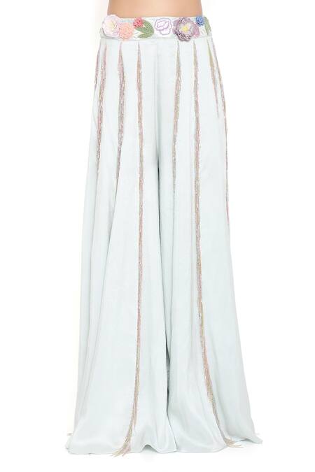 Blue embroidered sharara set featuring a square neckline blouse with floral bead and thread work. Paired with a sharara and dupatta adorned with hanging tassels.