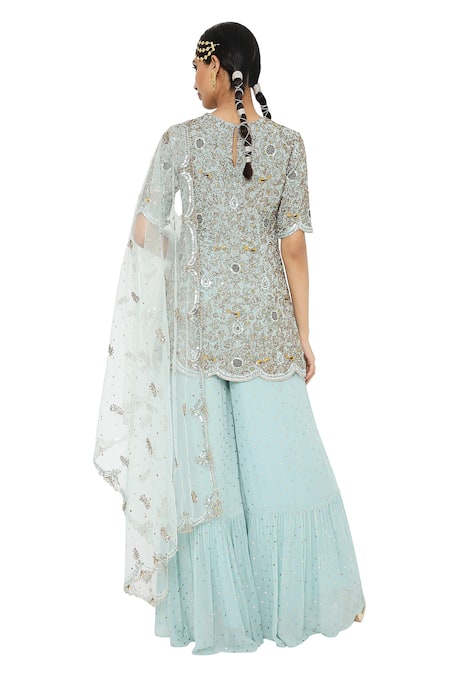 Powder blue short kurta in georgette base with embroidered details. Paired with dot mukaish frill sharara & embroidered net dupatta.