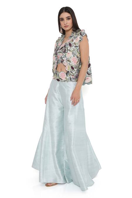 Blue dupion silk jacket featuring cap sleeves and scallop border with iris bloom embroidery. Paired with a matching embroidered bustier and kalidar sharara.