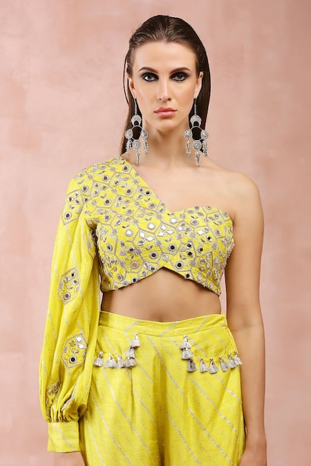 Green dola silk blouse featuring one shoulder design with a bishop sleeve and intricate mirror, resham, and zari embroidery. Paired with flared pants that have a stripe pattern and side pockets, complemented by fringe tassel details.