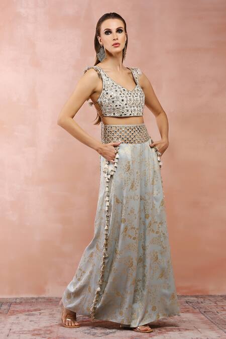 Powder blue choli featuring mirror embroidery in hexagon pattern and tassel detailing on the shoulder. Paired with a bird and floral woven palazzo that has a cutwork embroidered waistband and back tassel tie-up detailing.