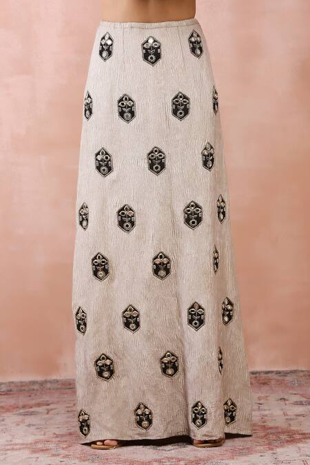 Rounded hem detail, Hexagon pattern embroidery, Dull gold mirror embellishments