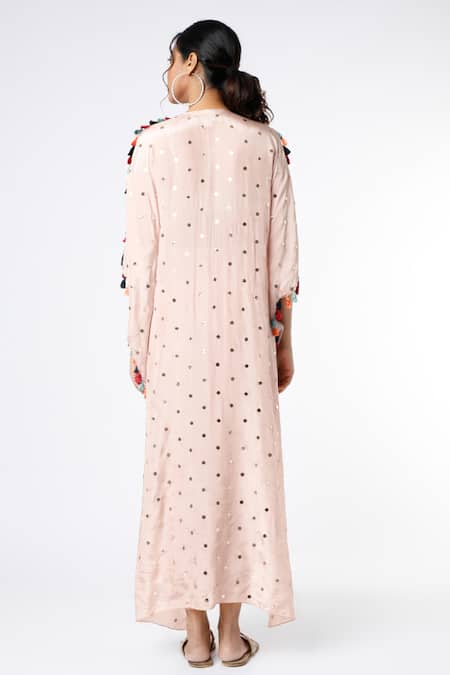 Rose pink silk high-low hem kaftan with dot mukaish embroidered yoke with drawstring details. Comes with jogger pants.
