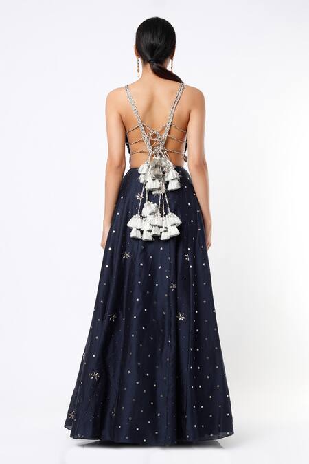 Navy blue lehenga with mukaish and sequin embroidery. Comes with embroidered back tie-up choli and mukaish net dupatta.