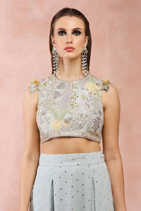 Powder blue pant saree featuring all over mukaish work with an attached pleated draped pallu. Paired with a round neck blouse adorned with mixed pattern embroidery including floral applique, zari, gota, thread, mirror, and sequin details.