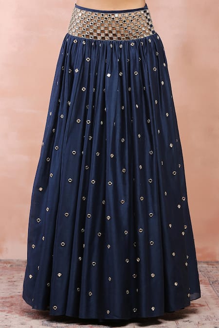 Navy blue lehenga featuring all-over mirror and thread embroidery. Paired with a round neck blouse and a georgette lurex dupatta with stripe pattern.