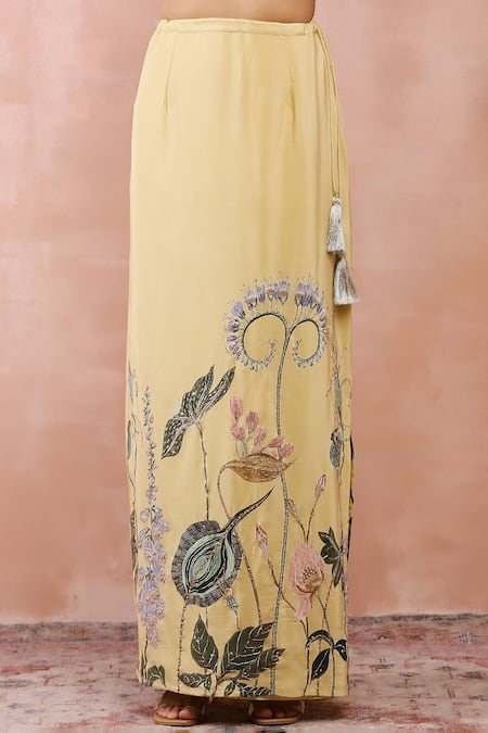 Yellow bustier featuring niloufar print and zari thread embroidery. Paired with a side slit skirt adorned with tassel detailing.