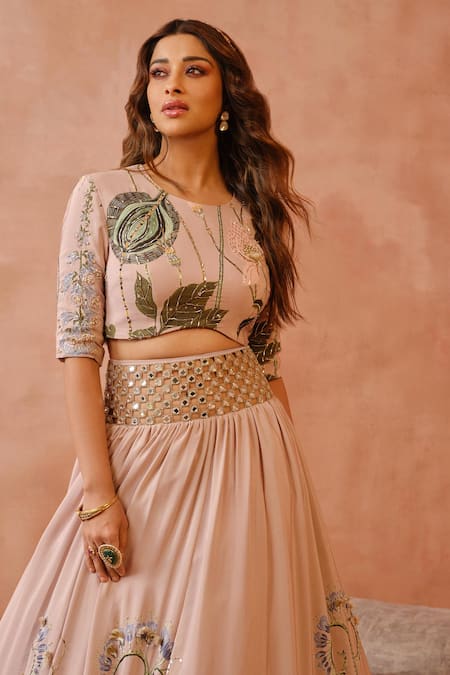 Pink Crepe, Muslin Cut Work, Beads, Gota Patti, Niloufar Print Lehenga Set