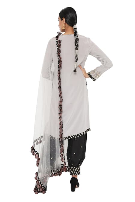 Grey embroidered kurta in crepe base fabric. Paired with black dot mukaish jogger style salwar in Abutai silk base & georgette dupatta.