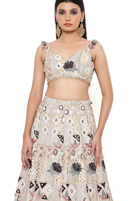 Off White Georgette And Organza Thread & Mirror Padma Embroidered Lehenga Set