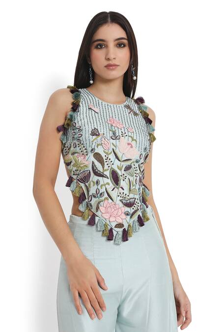 Blue Silk Tassels Halter Neck Padma Garden Embroidered Choli Sharara Set