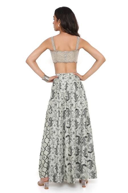 Grey lehenga with all-over floral print and attached jaal print drop crotch pants. Comes with pearl embroidered blouse.