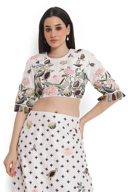 Off White Dupion Silk Embroidery Phool Bagh Round Neck Choli With Skirt