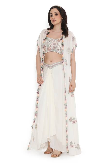 Off White Georgette Tassels, Embroidery Open Phool Jacket Draped Skirt Set