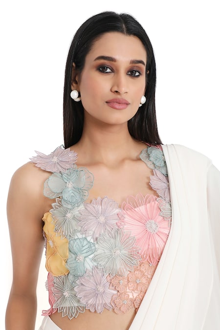 Off white ruffle pre-draped saree with attached lining. Paired with a floral applique work blouse featuring cutwork neckline and sleeveless design.