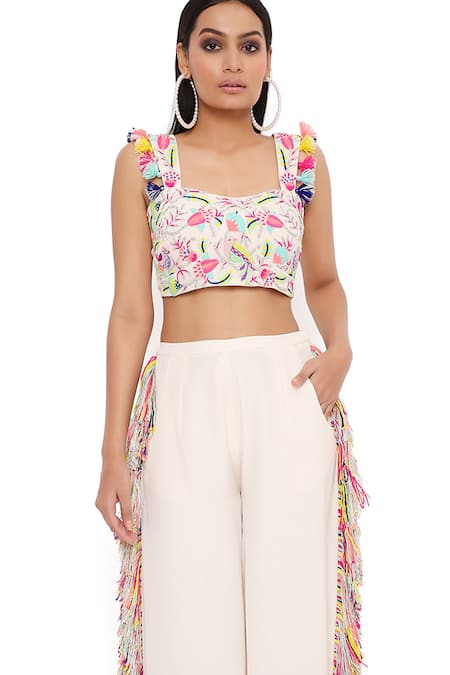 Stone bustier with multicolor thread embroidery and tassels on the straps. Comes with culottes.