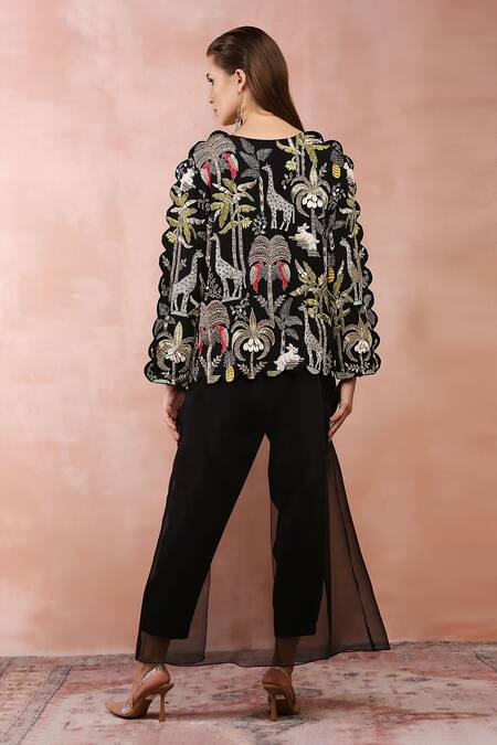 Black georgette top featuring all-over safari motifs with resham, beads, shell tassels, and zari embroidery. Paired with joggers pants that have an organza back overlay and an elasticated waistband.