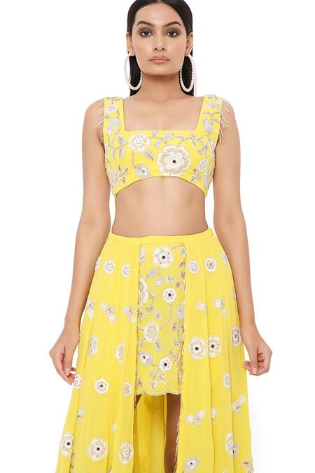 Yellow high low hem skirt with floral embroidery and mirror work. Comes with sleeveless top and net dupatta.