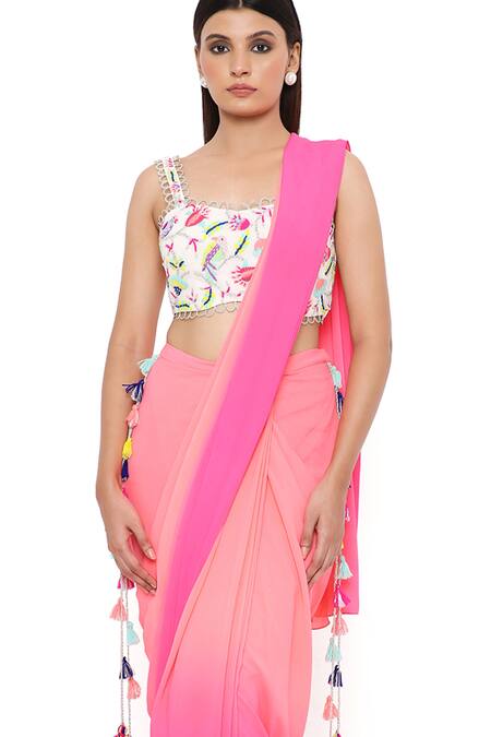 Coral and pink shaded pre-draped saree featuring multicolor tassel details. Accompanied by a stone embroidered bustier with scallop lace trim.