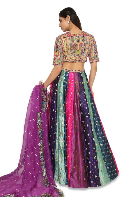 Multicoloured bandhani silk embroidered lehenga paired with yellow embroidered blouse. Paired with purple tassel dupatta.