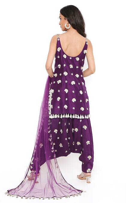 Purple silk kurta with embroidered motifs and tassels on the border. Comes with low crotch pants and net dupatta.
