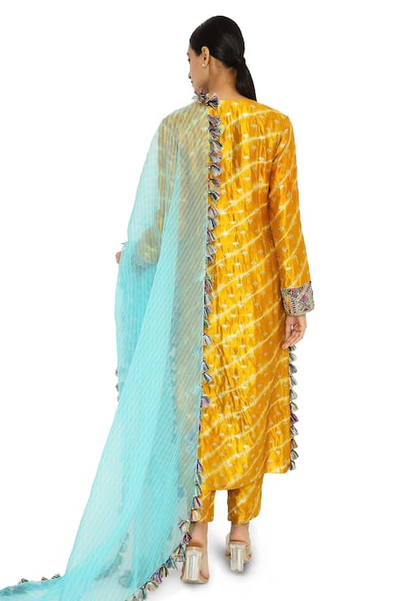 Mustard leheriya silk kurta with Amritsar embroidered & floral motifs. Paired with pant & aqua leheriya organza dupatta.