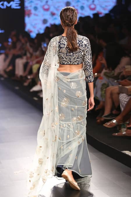 Blue Dupion Silk And Tulle Embroidery Hibiscus Sita Frill Saree With Blouse