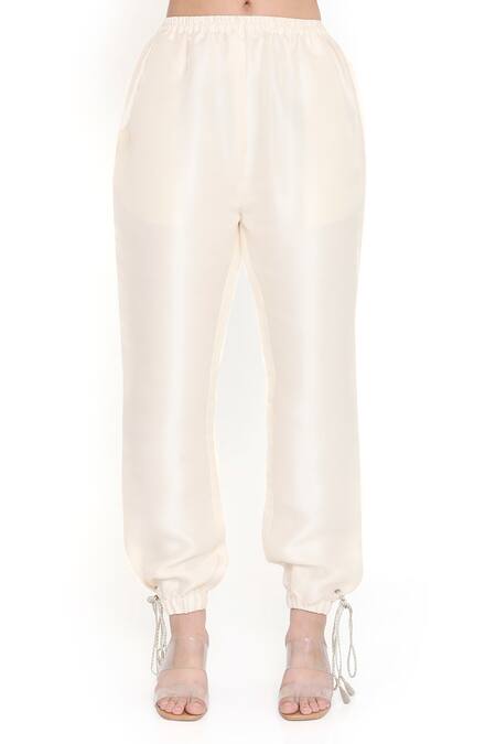 Off white jacket featuring intricate bead, sequin, stone, and tassel embroidery. Paired with elasticated jogger pants with a bottom tie-up detail.