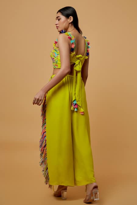 Green blouse featuring floral thread embroidery and tassel details. Paired with matching pant with tassel accents.