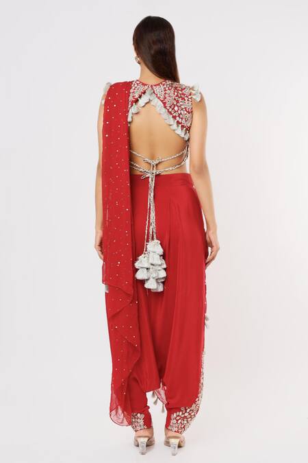 Cherry red pre-draped pant saree featuring intricate thread sequin embroidery and mukaish work. Paired with a matching floral embroidered sleeveless blouse with a back drawstring closure.